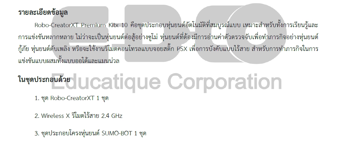 นี่คือชุดประกอบหุ่นยนต์อัตโนมัติที่สมบูรณ์แบบ เหมาะสำหรับทั้งการเรียนรู้และการแข่งขันหลากหลาย ไม่ว่าจะเป็นหุ่นยนต์ต่อสู้อย่างซูโม่ หุ่นยนต์ที่ต้องมีการอ่านค่าตัวตรวจจับเพื่อทำภารกิจอย่างหุ่นยนต์กู้ภัย หุ่นยนต์ดับเพลิง หรือจะใช้งานรีโมตคอนโทรลแบบจอยสติ๊ก PSX เพื่อการบังคับแบบไร้สาย สำหรับการทำภารกิจในการแข่งขันแบบผสมทั้งแบบออโต้และแมนน่วล